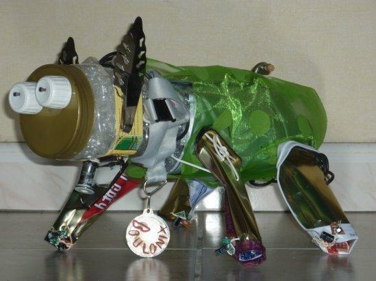 Les pattes sont des boîtes de thé en métal dont j’ai tordu un côté. J’ai percé des trous dedans pour faire passer un fil et l’accrocher au corps. Mais ça ne lui permettait pas de tenir. Les pattes s’écartaient et le chien se couchait par terre. Or, je voulais vraiment faire mieux qu’avec Poupi.