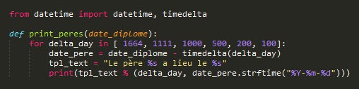 Il s’agit d’un petit bout de code en python (mon langage de programmation préféré) listant les dates des pères, en fonction de la date de remise des diplômes à passer en paramètre.