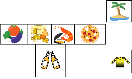 J’ai mis des dessins pour les noms des bâtiments. Nous avons donc, pour le bâtiment principal : les Légumes, les Fromages, les Crustacés, les Pizzas. Pour les deux bâtiments externes : les Îles et les Daltons. Et bien sûr le foyer, avec des bières.