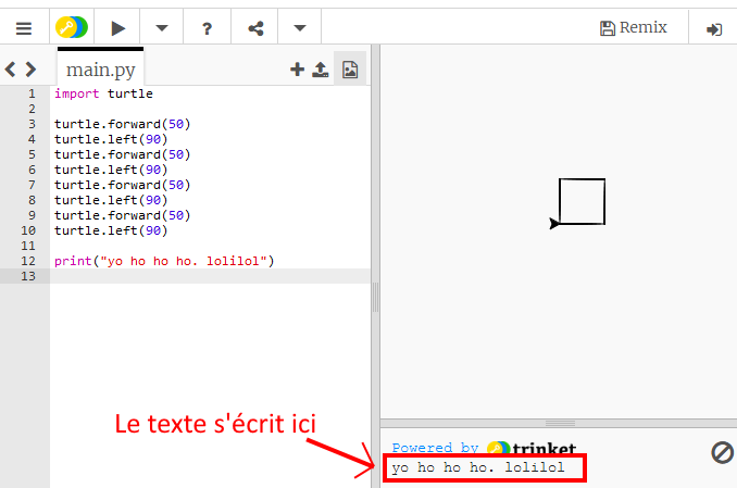 Juste pour montrer que tu as bien compris, tu vas changer le code pour me dessiner un beau carré de 50 pixels de côté. T’as juste à re-écrire trois fois de plus les deux dernières lignes. Fais un copier-coller, ça passe crême. Ne recopie pas « import turtle », qui n’a besoin d’être écrit qu’une seule fois au début. Appuie sur Play pour relancer le programme.