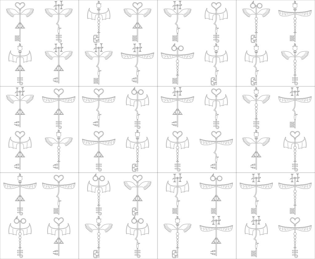 Nous avons donc : (3 types d’aile) x (4 types de bas de clé) x (4 types de haut de clé) x (3 types de tige). Soit 3 * 4 * 4 * 3 = 144 combinaisons différentes de clés.
